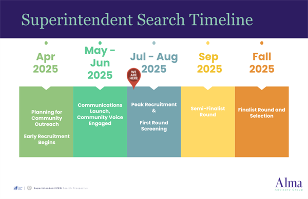 Our search is now entering the candidate screening and interviewing phases (timeline shown below). The Board has a commitment to center community voice in this process. This prospectus ensures our families, students, educators, and community members can see their priorities reflected in our search process.